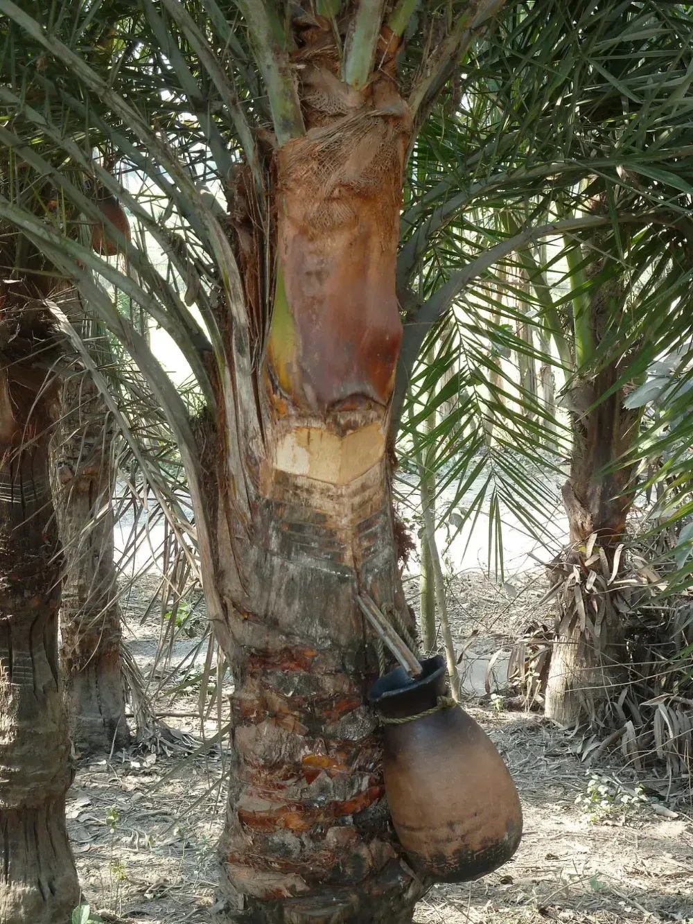 圖1、印度西孟加拉邦用于采收糖汁的銀海棗,注意引流條和罐子丨wiki