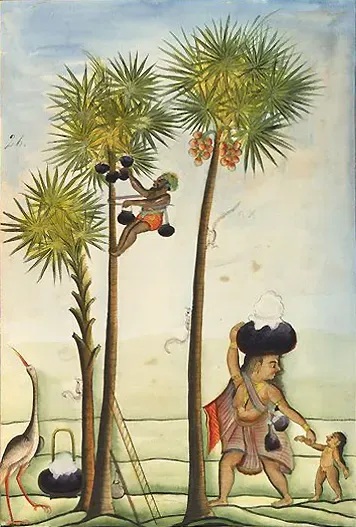 在糖棕(Borassusflabellifer)的花序上收集糖汁。左邊樹上黑色的是裝樹汁的陶罐,右邊樹上偏紅色的是糖棕的果實,其未成熟的胚乳也可以吃,在南亞和東南亞很多地方都能吃到丨wiki。
